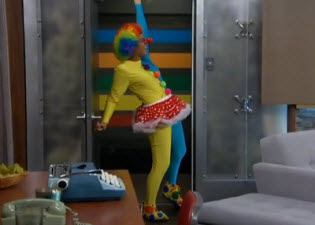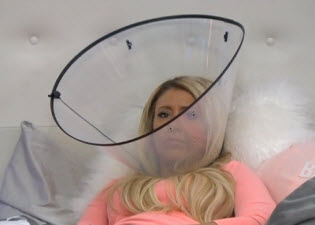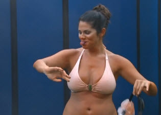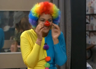 Turned out Amanda's meltdown was really irrelevant anyway because Jessie ended up with the POV. It was a Pollyanna exchange comp, and Judd actually won, but ended up taking $5K and leaving Jessie with the veto. Spencer got the other good prize, a Bahamas trip. On the punishment end GM is stuck in a Cone of Shame, dog/cat "lampshade" for 48 hours, Amanda has to get 50 Shades of Orange spray-tans, and Candice is in a Clownie-tard for the week.