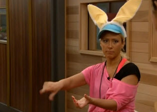 They toddle out to play HOH and it's a bunny-hop/move eggs through chicken wire race to get 12 eggs in the basket. Anyone in last place at the end gets stuck in a chicken suit. The whole thing was blocked from the feeds, and when they came back GM had the HOH key. Judd and Spencer are slated to get chickened.