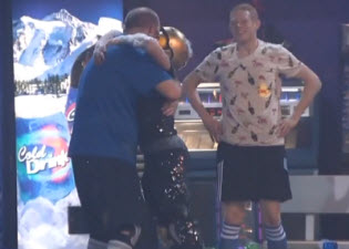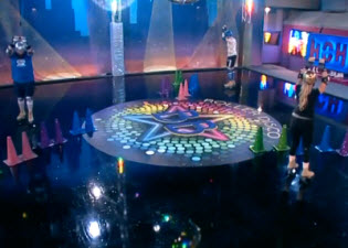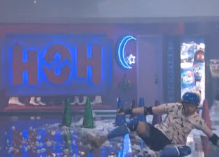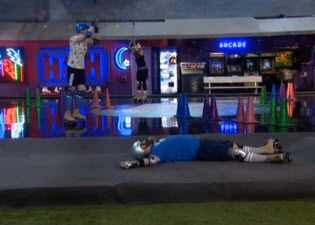 The feeds finally came back on a bit after 9 BBT, and they were rollerskating around a rink holding on to a handle. There were some cone obstacles, and BB threw in their usual "weather" effects, fog, water, foam, etc. The comp honestly didn't look that hard to me. But not surprisingly, Spencer fell after mere minutes. Instead of keeping his skates on the ground and just letting the spinning handle wheel him, he was "stepping" and quickly lost his footing and couldn't hold on. Andy and GM were both skating, and each lost footing a few times, but easily held on to the handle, so it looked like it might go a while. But then Andy screamed something about his knee and moments later he had fallen. Glitter rained down on GM and she took Part 1 of the Final HOH.