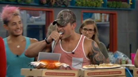 They also got their HN supplement: Deep Fish Pizza. This turned out to be pizza crusts, including gluten-free for Christine and Caleb (who thinks flour is increasing his estrogen level and giving him breasts--again, can't make this stuff up), and various types of canned fish. In addition to the HNs, Jocasta's on slop for a week as some sort of comp consequence. I suspect she had to either take slop to stay in the comp at some point. In any case they're all pretty happy with the extra options.