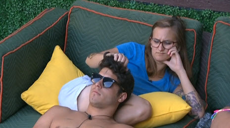 Caleb then went on a confrontation loop, talking first to Amber, who got him rolled back around to her side. He then started calling in witnesses and eventually became sure that Frankie was the rat. After a bit of scurrying Frankie was able to undo some of that damage, but Caleb was still back on SaveAmber. Unfortunately during his Amber-Must-Die time, a few of them had already told him they were voting her out. So he spent what felt like an eternity campaigning for her to stay. They quickly decided to just appease him, though it wasn't that easy to shut him up.