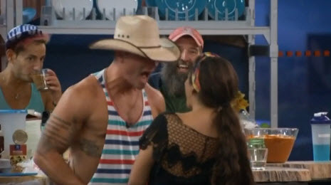 I had advocated Mission A because I knew Mission B would end up being another Attack Zach scenario. But in the end, it didn't matter. TA hid a bunch of things, including Zach's Gators shirt, Cody's (Hayden's) blue flowery hat, Caleb's cowboy boots, and Christine's stuffed tiger, under the liner in the storage room recycle bin. They had planned to leave a message on the bathroom mirror about keeping an eye on your stuff, but before it even got to that, Cody realized the hat was missing and went batcrap crazy. Most others quickly realized their stuff was missing, though Victoria first thought she missing a necklace they hadn't taken (which Frankie eventually found and added to the stash) and Christine took a while to notice the tiger (which it was later pointed out was not technically clothing). They all went crazy for a while and accusations were flying left and right, with the prime suspects being Zach and Victoria. It was all fun and games for a while, but then things got real when Caleb started telling Zach they all knew he was "the Saboteur" and he was going home for it.